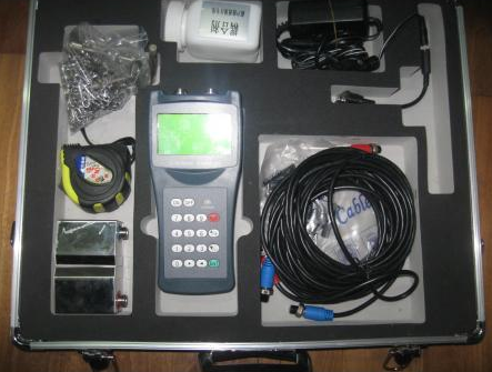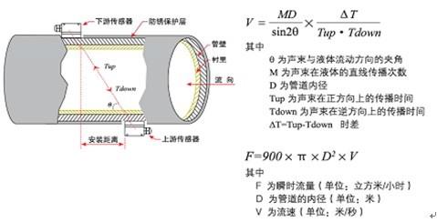 KLN-100H型手持式超聲波流量計利用了低電壓、多脈沖時差原理,采用高精度和超穩定的雙平衡信號差分發射、差分接收數字檢測技術,當超聲波束在液體中傳播時,液體的流動將使傳播時間產生微小變化,其傳播時間的變化正比于液體的流速。零流量時,兩個傳感器發射和接收聲波所需的時間完全相同(唯一可實際測量零流量的技術),液體流動時,逆流方向的聲波傳輸時間大于順流方向的聲波傳輸時間。其關系符合下面表達式:
